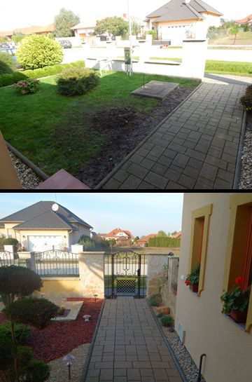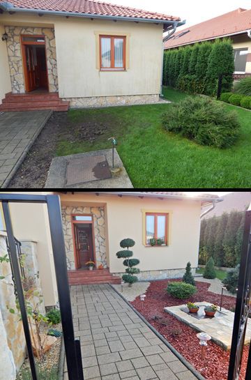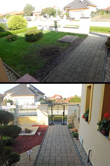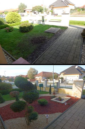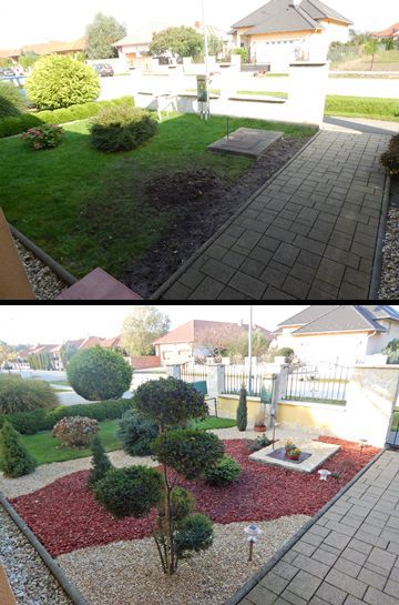 Már rég ígértem, hogy küldök fotókat az elkészült előkertről. Most sikerült eljutnom idáig. Nem lett minden olyan ahogy tervezted, mert nem tudtunk sajnos mindent beszerezni. A kövek hiányoznak még illetve középről kihalt a nyáron az ezüst színű bokor amit beterveztél, de így is nagyon szép lett szerintem. Sokan megcsodálják és mindenkinek nagyon tetszik a szabálytalan formájú mulcs illetve kavics variáció is. Mi is imádjuk és nagyon köszönjük a szuper ötleteket amit adtál, nélküled nem lett volna ilyen szép az előkertünk. Nagyon egyedi és nekünk eszünkbe sem jutott volna még csak hasonló sem, de szerintem a szombathelyi kerttervezők sem álmodtak volna meg ilyen egyedi előkertet. ( A környéken még csak hasonló sincs. ) Szóval nagyon köszönjük a segítségedet."
